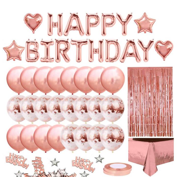Rose Gold Party Decor with Happy Birthday Banner, Heart Star Confetti
