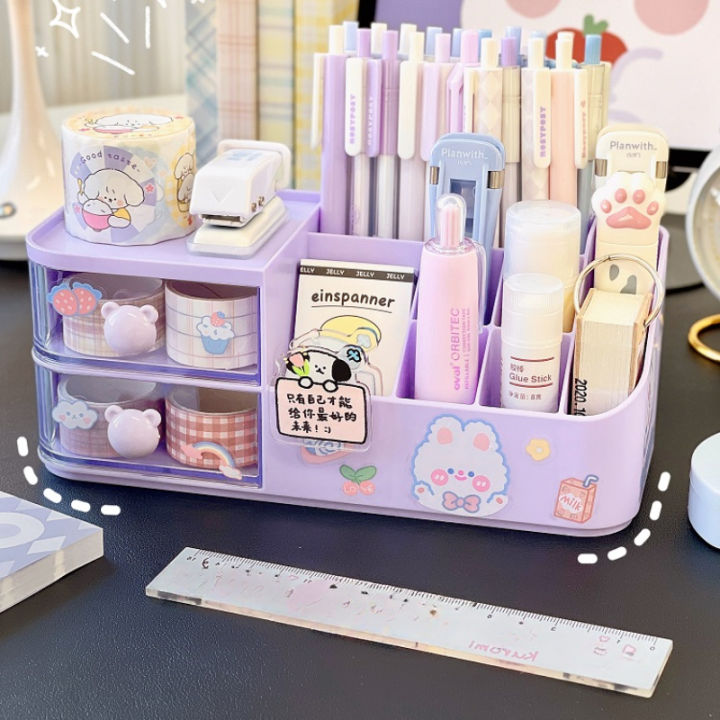 Ins Kawaii Desk Organizer Storage Box Cute Bear Handle Drawer Stationery Pen Holder Sticky Note Tape Storage Box Organizer Rack