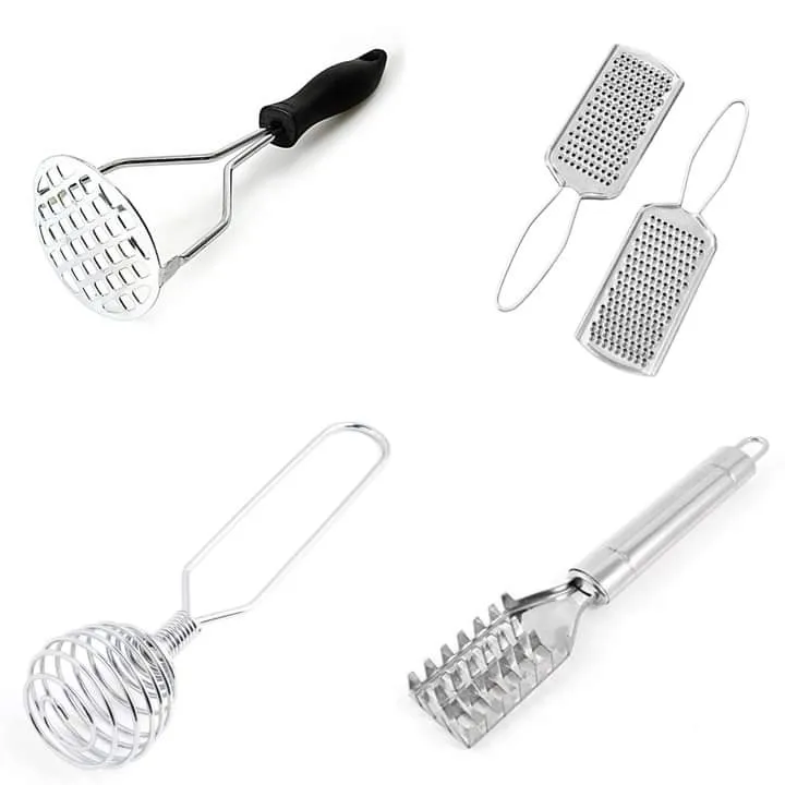 04 Pcs kitchen tools set Combo Pack (Potato Masher /Garlic ,Ginger, Cheese Grater/Egg Beater/Fish scale remover)