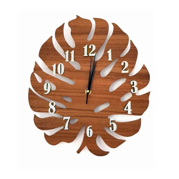 12 Inch Wooden Wall Clock with Leaf Pattern, Laser Cut Design, High Quality Movement, Customizable Engraving