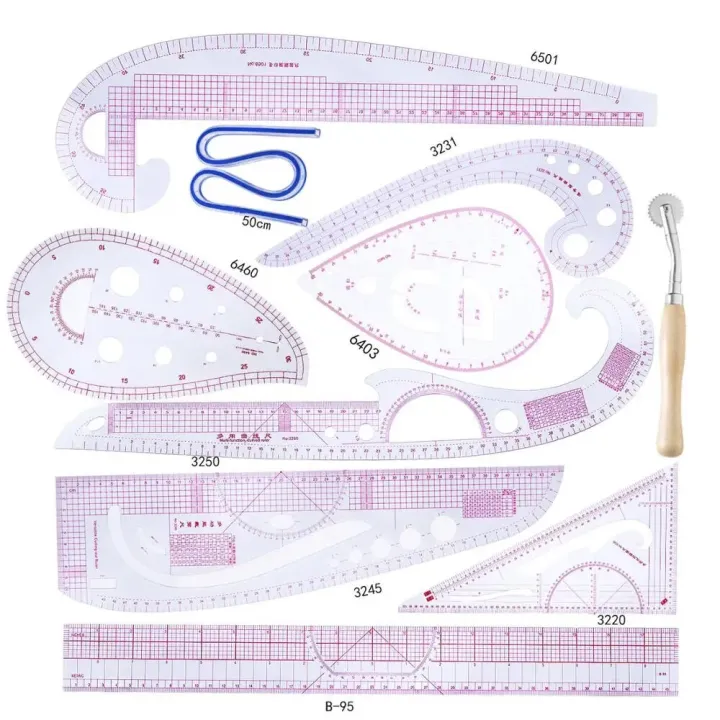 13Pcs Ruler Tailor Measuring Kit Clear Sewing Drawing Ruler Yardstick Sleeve Arm French Curve Set Cutting Ruler Paddle Wheel