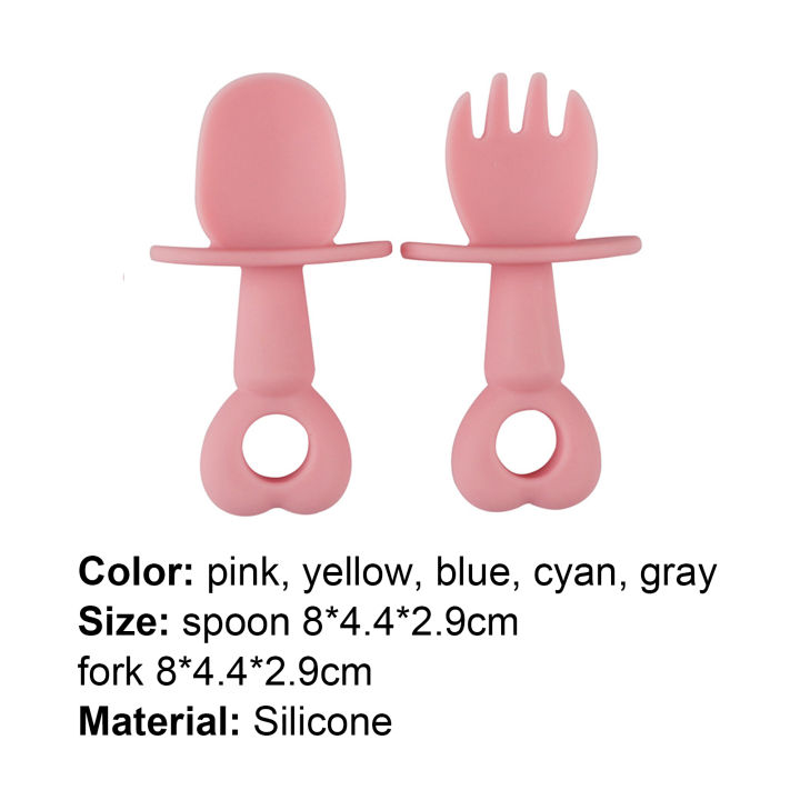 2 Pcs/Set Kid Spoon Kit Food Grade Rounded Edge Silicone Self Feeding Baby Fork Set for Toddler