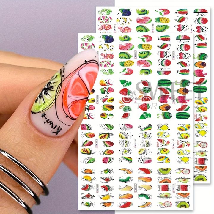 2 Sheet Abstract Line Fruit Water Nail Sliders Geometry Pawpaw Watermelon Avocado Image Decal Summer Tropical Charm Tattoo Foils