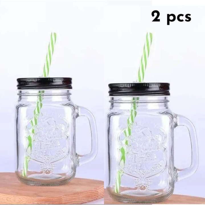 2pcs Glas Mansion Jar with Straw, 430 ml Set of 2, Mock Tail jar/Smoothie jar/Juice Jar (Random Color)