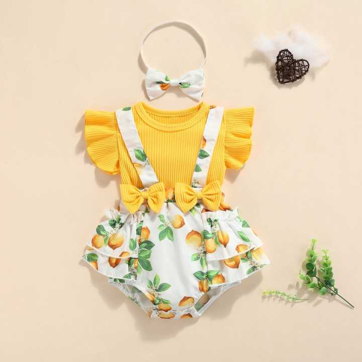2Pcs%20Sweet%20Style%20Baby%20Girls%20Outfit,%20Toddlers%20Summer%20Floral/Lemon/Dot%20Printing%20Fly%20Sleeve%20Splicing%20Romper%20+%20Bow%20Headwear%20Set%20-%20Image%201