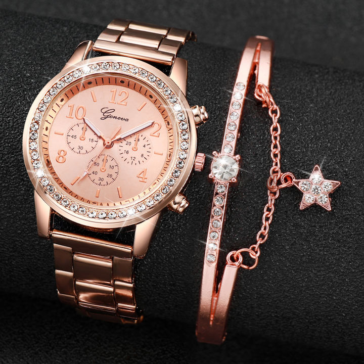 2PCS Women's Watch Fashion Rhinestone Rose Gold Steel Band Analog Quartz Watches Bracelet Set