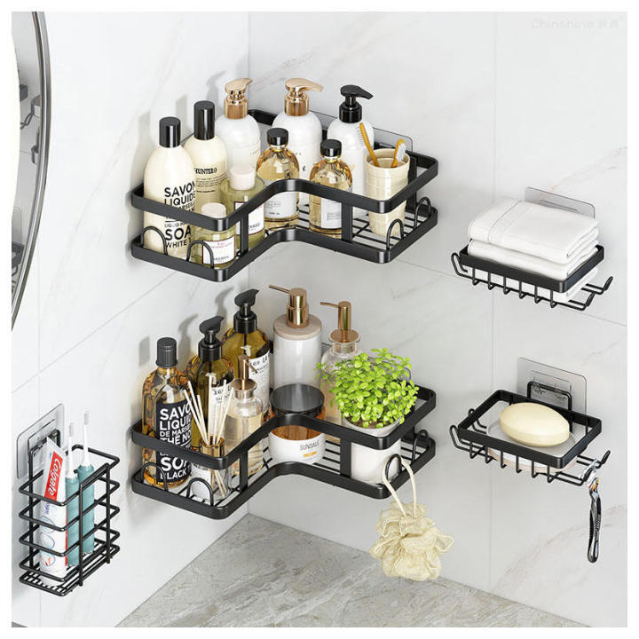 5-Piece%20Bathroom%20Organizer%20Set%20-%20Self-Adhesive%20Corner%20Shower%20Caddy,%20Soap%20Dish%20&%20Toothbrush%20Holder%20-%20Rust-Proof%20Stainless%20Steel%20-%20No%20Drilling%20Wall%20Mount%20Storage%20Rack%20(Black)%20-%20Image%202