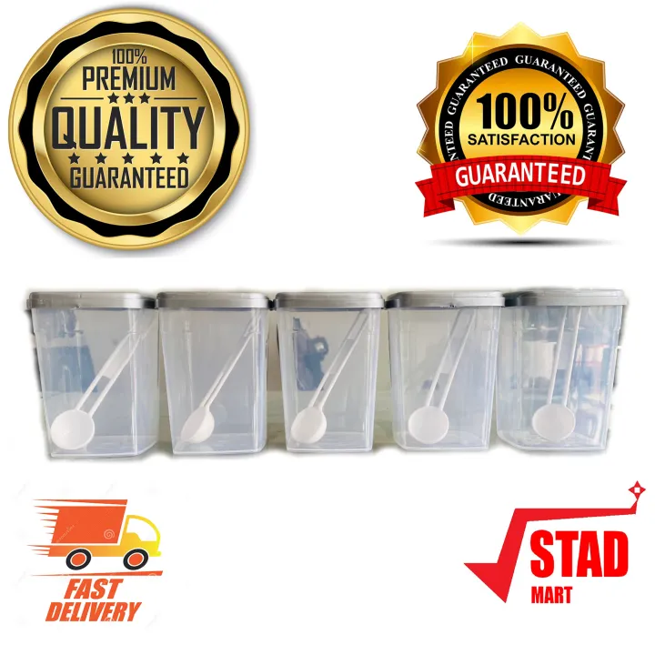5%20Pieces%20Visual%20Kitchen%20Spicy%20Containers%20With%20SILVER%20Lid%20SQUARE%20SHAPE%20LARGE%20TUB%20Set%20Transparent%20Plastic%20Spice%20Bottles%20Jar%20with%20Spoon%20set%20-%20Image%201