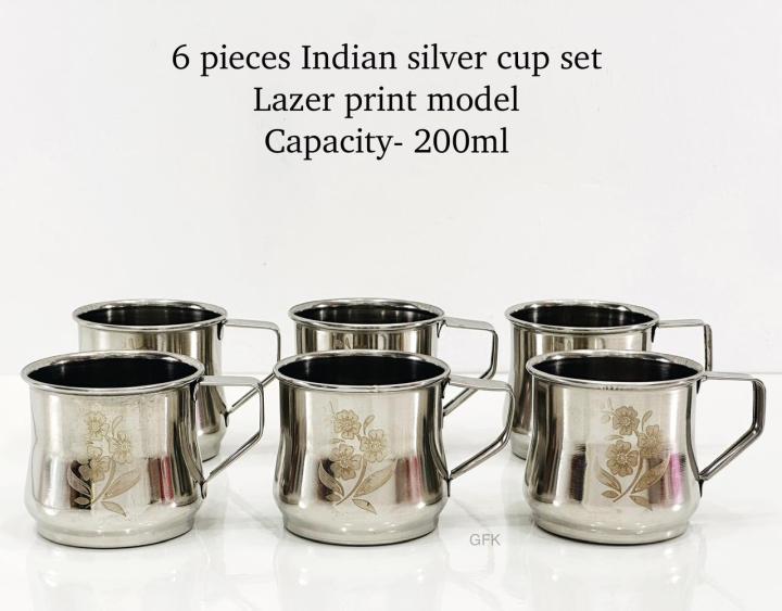 6 pieces Indian silver cup set Lazer print model Capacity- 200ml