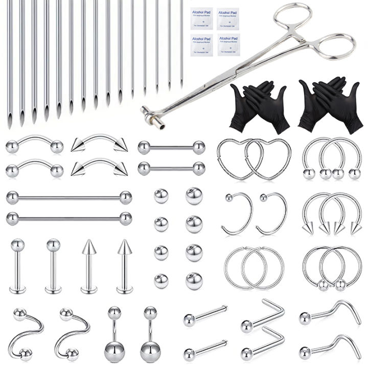 60PCS Body Piercing Tool Kit 14G Disposable Professional Body Self Piercing Kits Clamp Gloves Tools Ear Lip Nose Navel Piercings