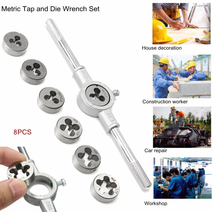 8PCS/Set Handheld Metric Screw Die Set, M3-M12 Wrench Bearing Steel Coarse Thread External Thread Cutting Tapping Hand Tool Kit