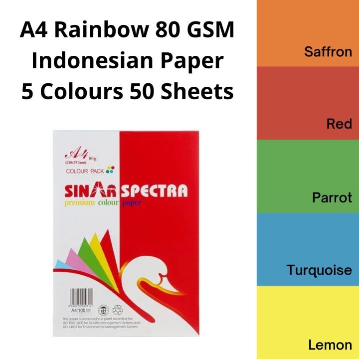 A4 Rainbow 50 Sheets Pack with 5 Colours 80 GSM Indonesian Colour Photocopy Papers