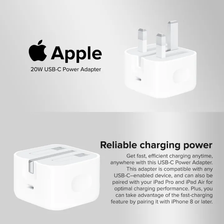 Apple 20W USB-C 3-Pin UK Power Adapter Plug for Apple iPhone Fast charger Wall Charger Type-C Mobile Phone iPhone 15/14/13/12/11 iPad Tabs Tablet Folding Pins Charger UK Phone Charger Tablet Charger Phone Adapter Tablet Adapter Tab Adapter Tab Charger