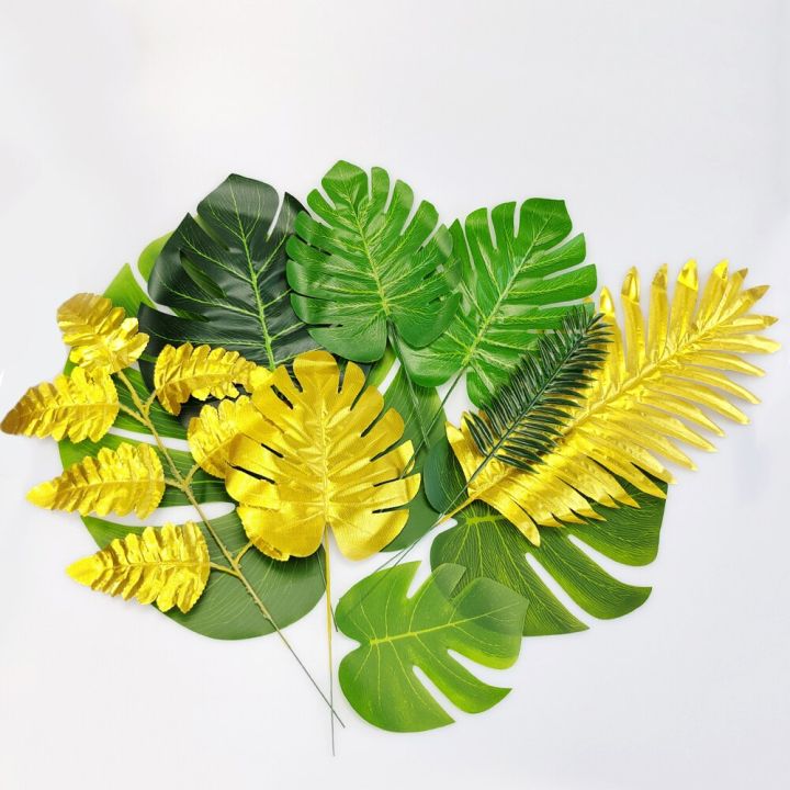 Artificial Turtle Leaves Green Gold Tropical Palm Leaves Monstera Leaves for Jungle Birthday Hawaiian Party Decorations