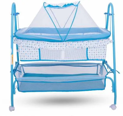 BayLand 208 Comfort Cradle Cot - New Born Baby Swing Cradle with Mosquito Net & Wheel (Blue)