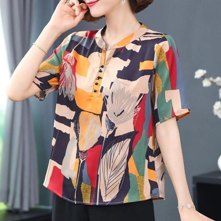 bellylady%20Women%20Cotton%20Summer%20Stand%20Collar%20Blouse%20Retro%20Printing%20Short%20Sleeves%20Shirt%20Plus%20Size%20Loose%20Casual%20Tops%20-%20Image%201