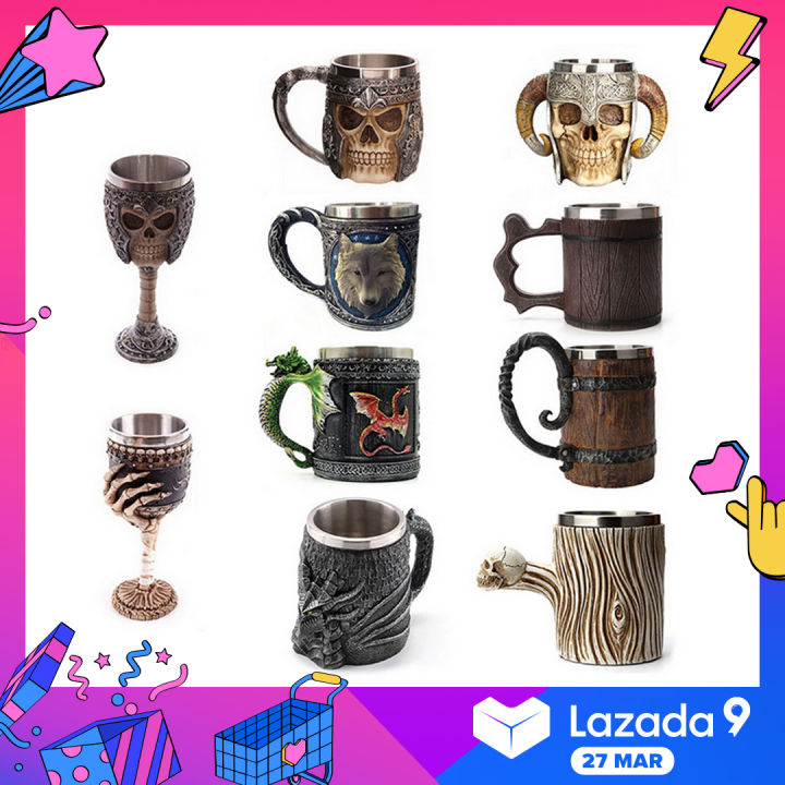 【BestGO】1PCS Personalized Double Wall Stainless Steel 3D Skull Mugs Coffee Cup Mug Skull Knight Tankard Dragon Drinking Cup