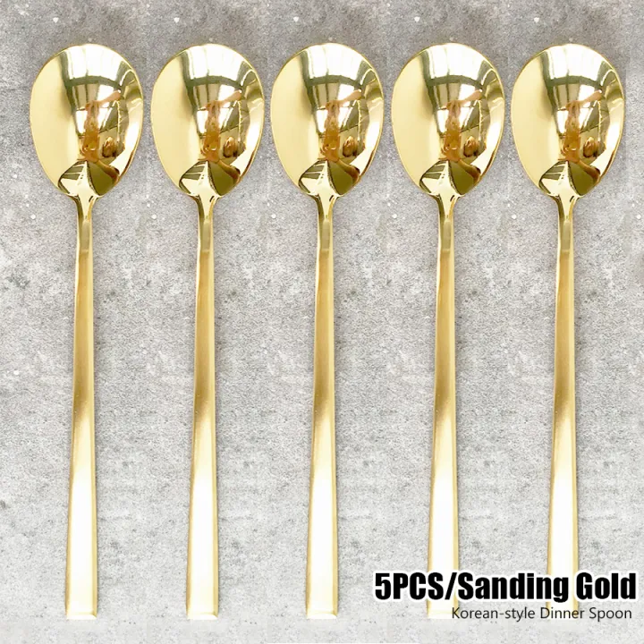 【BestGO】21cm Gold Korean-style Stainless Steel Dinner Spoons Korean-Style Soup Spoon Dinnerware Flatware Sets 5pcs