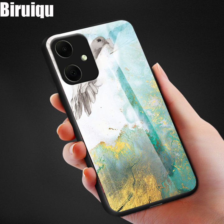 Biruiqu For Samsung Galaxy A05 Shockproof Fashion Marble Tempered Glass Back Case Cover