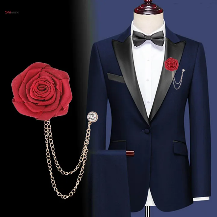 Bridegroom Wedding Corsage, Lapel Pin, Handmade Rose Flower Brooch, Fashion Groom Boutonniere Badge Tassel Chain for Men's Suit Prom Ceremony