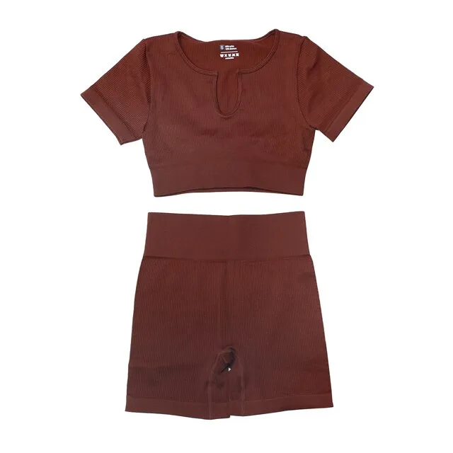 【Brown set XL】 11 Colors Yoga Set Clothes Women Sportwear Short Crop Top High Waist Gym Shorts Sport Outfit For Woman