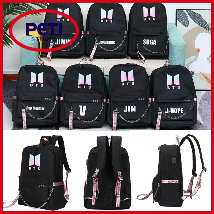 BTS BT21 Chain Backpack Cute Canvas Shoulder Bags USB Charging Interface School Bag Travel Backpack Design Kpop Jungkook Jimin Suga V