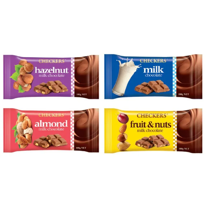 Checkers Chocolate Hazelnut +Milk Chocolate +Fruit & Nuts + Almond [100g] x 4Pcs Combo