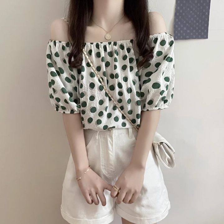 Chiffon Korean Style Polka Dot French Style Short Sleeve New Puff Sleeve Summer Shirt Top off-Shoulder Floral Western Style Youthful-Looking