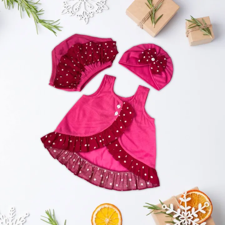 Crossover baby frock plain design frock with frill panty short and turban bow cap