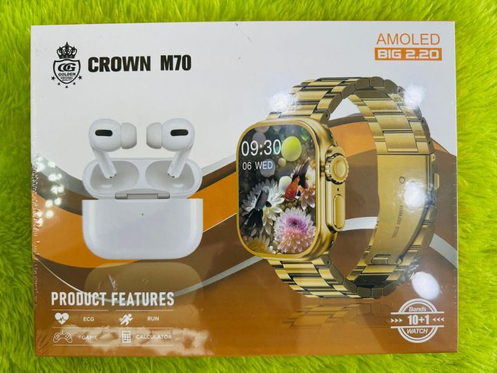 Crown M70 Ultra 2 Smart Watch Gold Edition 10 in 1 + Airpods