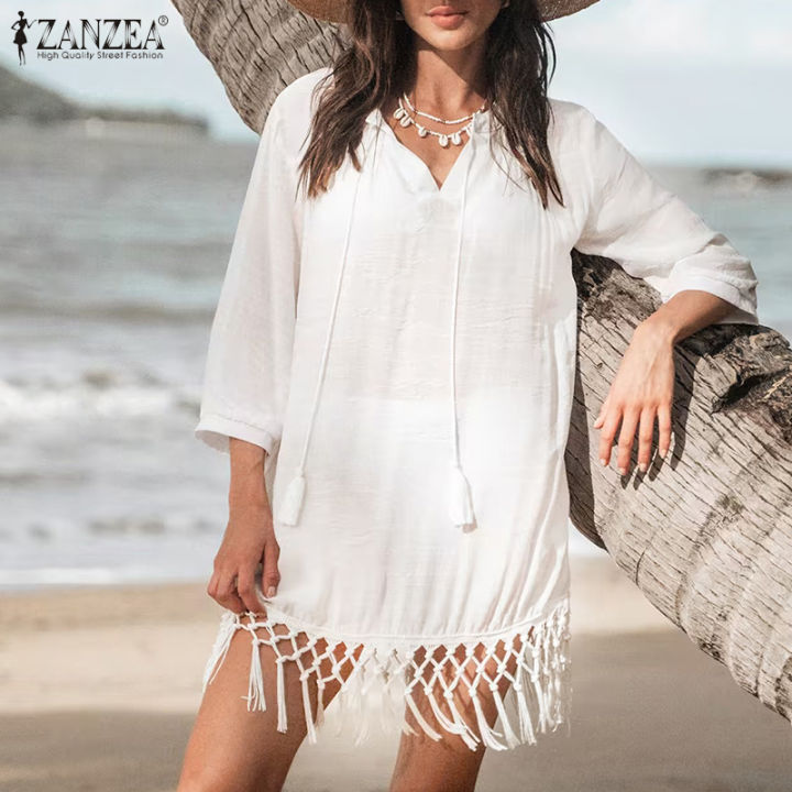 【FOOT SOFA】Womens Solid V-Neck 3/4 Sleeve Dress Holiday Beach Tassel Patchwork Mini Sundress #15