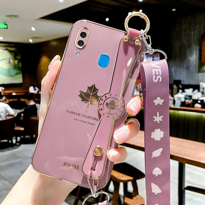 For Samsung Galaxy A30 A20 Back Cover with Lanyard + Wristband Fashion Shiny Maple Leaf Plating Bumper Stand Holder Case Camera Protection Soft Silicone Mobile Phone Cases