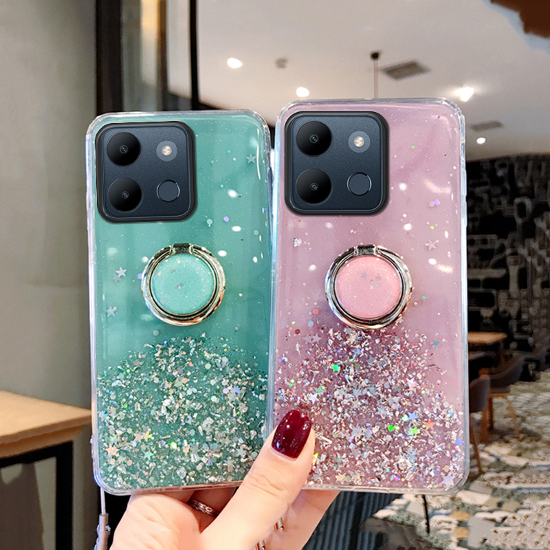 For Tecno POP 7 Pro Spark Go 2023 case Shiny Ring Glitter Soft Transparent Holder Stand Back Cover with ring Stars Moon Girls For Tecno Spark Go 2023 POP 7 Pro Back cover Phone Cases