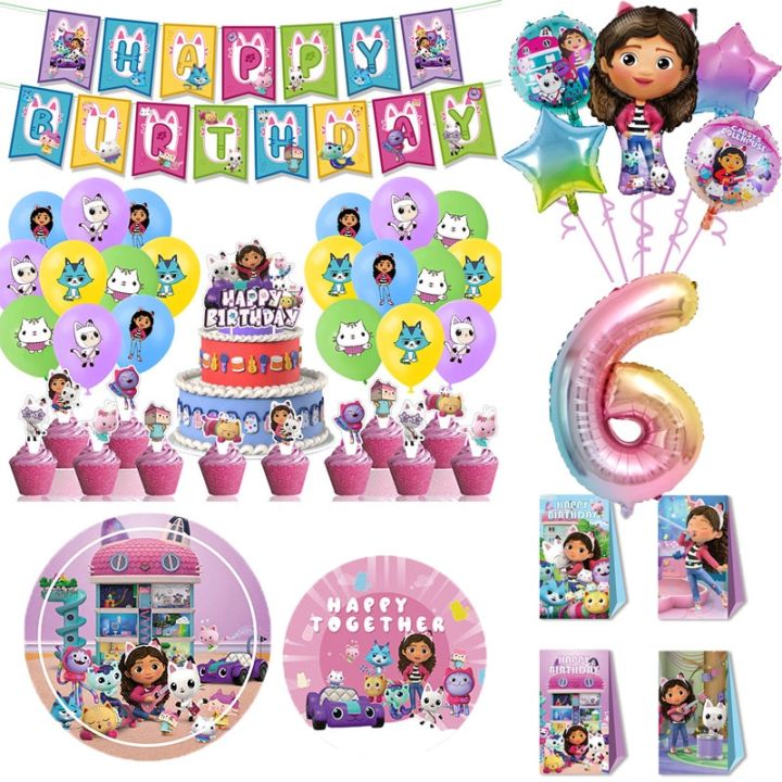 Gabbys Dollhouse Birthday Decoration Cats Balloon Disposable Tableware Backdrop For Girl Gabby Doll House Figures Party Supplies