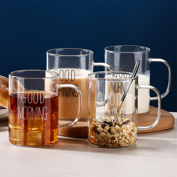 Good Morning Glass Mug Coffee Milk Breakfast Cup Tumbler with Handle Transparent Drinkware Household for Children Set