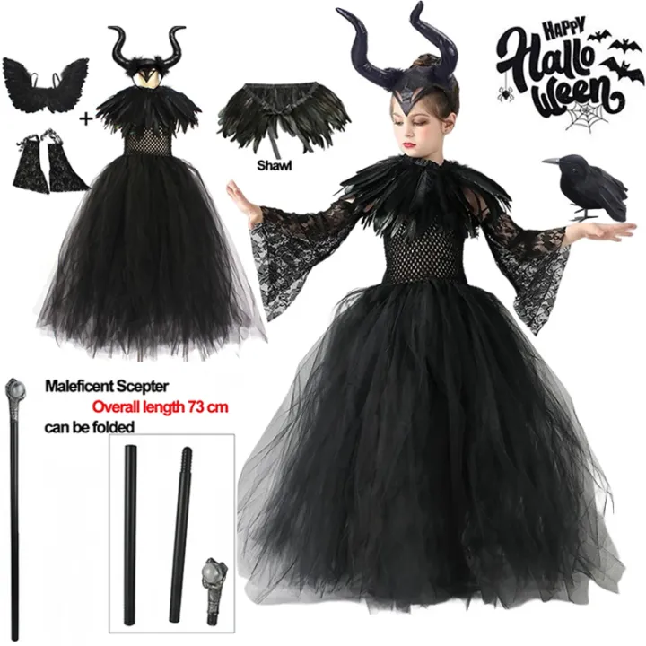 Halloween Costume Maleficent Tutu Dress For Girls Cosplay Evil Queen Black Mesh Princess Dress Kids Crow Wand Maleficent
