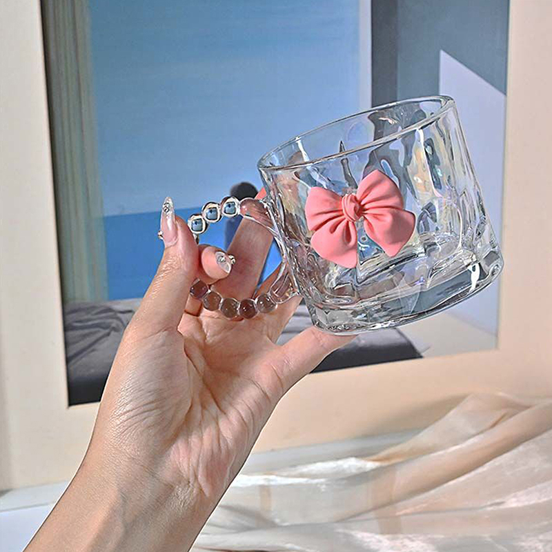 Handle Glass Mug Pink Bow Transparent Water Cup Flower Tea Cup Coffee Cup Portable Drinking Cup Queena