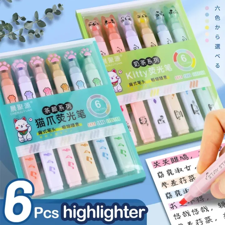 【HOT】 6 Pcs/Set Highlighter Pen Color Markers Double Ends Pastel Fluorescent Set Kawaii Pens Cute Stationary School Office Supplies