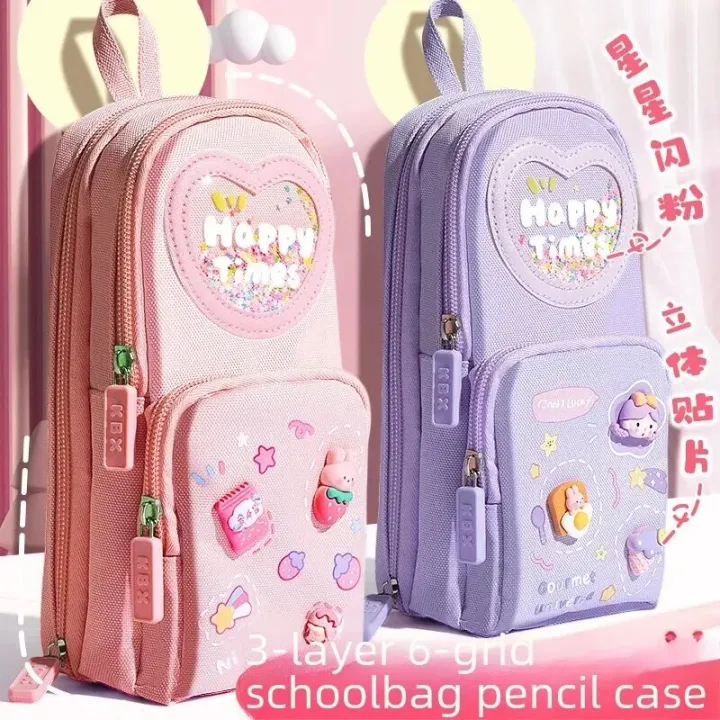 【HOT】 Large Capacity Three-Layer Pencil Bag Simple Cute Cartoon Design For Primary School Girls High Value Women's Stationery