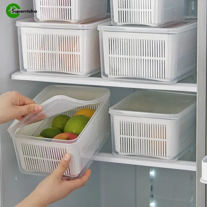 Kitchen Plastic Double Drain Basket with Lid/Household Refrigerator Rectangular Storage Boxs/Fruit Vegetable Cleaning Strainers Kitchen Tools