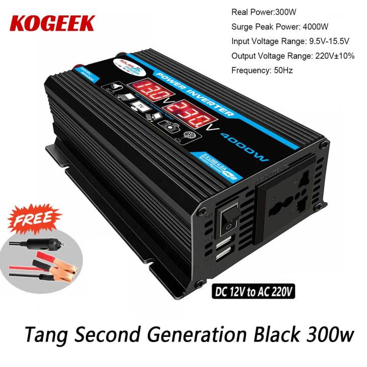 KOGEEK Real 300W Modified Sine Wave Inverter High Frequency 4000W Peak Power Watt Power Inverter DC 12V to AC 220V Converter Car Power Charger Inverter with 2.1A Dual USB Port Batte-ry Clips Display Screen