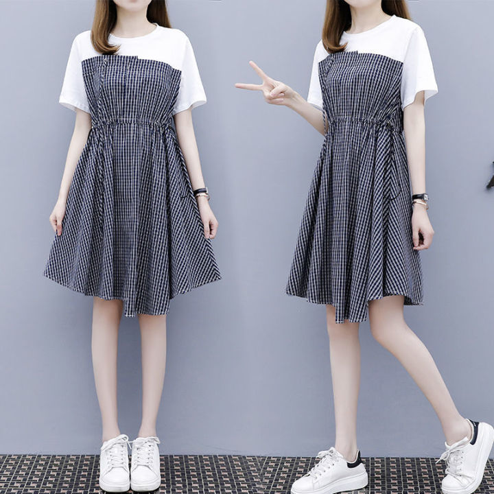 Korean Style Summer New Plaid Stitching Two-Piece Drawstring Waist Slimming DesignAWord Small Size Dress