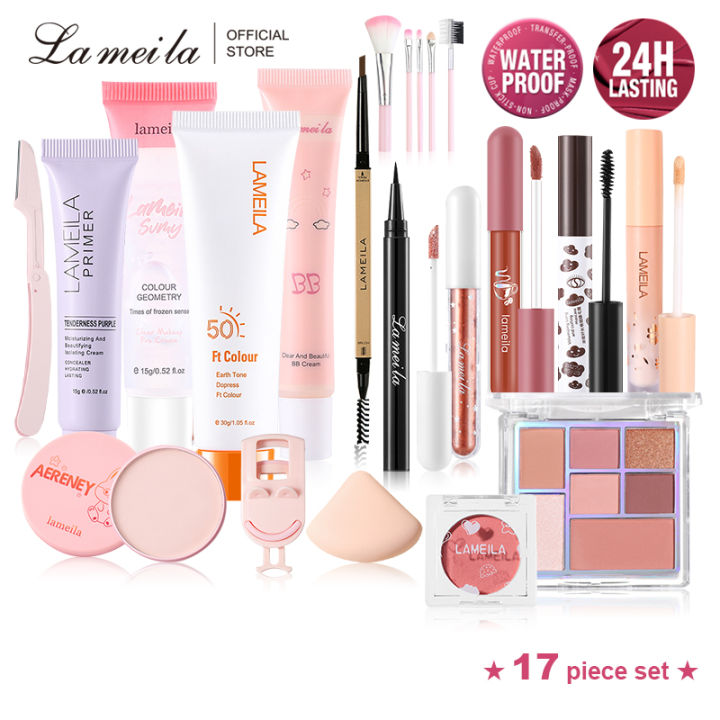 Lameila 17 Pcs Set Makeup Set Includes Protective cream+ BB Cream +Set up powder + Eyeshadow + Eyebrow pencil + Eyeliner + Mascara + Pre makeup lotion + Matte lipstick + Isolation Primer Cream + Concealer + Blush + 4 Pcs Set Makeup Tools