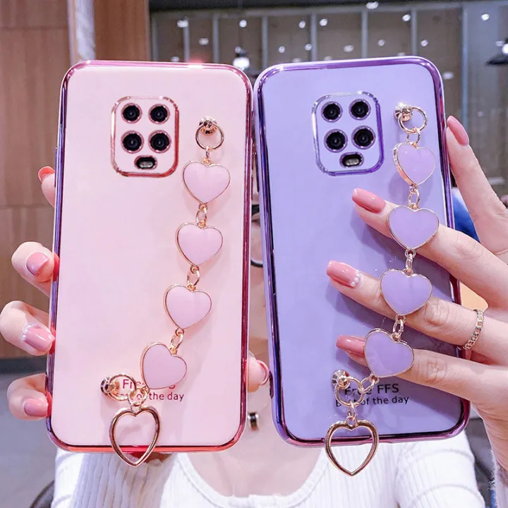 LECOMES for Xiaomi Redmi Note 9 Pro Back Cover with Love Heart Bracelet Chain Luxury 6D Plating Shiny Soft Silicone Mobile Phone Case Pouch Girls