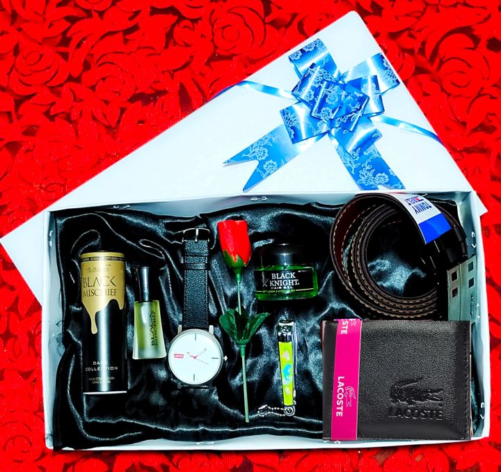 Luxury Men's Celebration Gift Pack With Free Gift Box - With Attar, watch, Rose, Hair Cream, Nail Cutter, Belt, Wallet Anniversary Present Sets - Valentine's Day Gift Basket Package for Him/Men/Boy/Husband/Bestie/ Lover