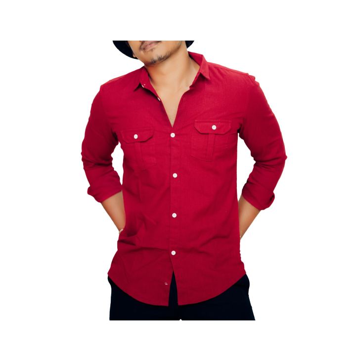 New Men's Double Pocket Long Sleeve Pure Linen Shirt