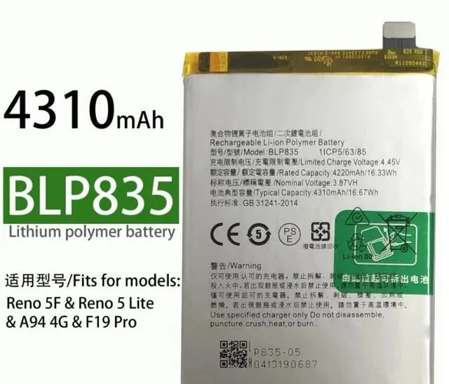 Oppo Reno 5F Battery Oppo Reno 5 Lite Battery Oppo A94 4G Battery Oppo F19 Pro Battery Oppo BLP835 Battery 4310mAh Battery with 6 Month Warranty