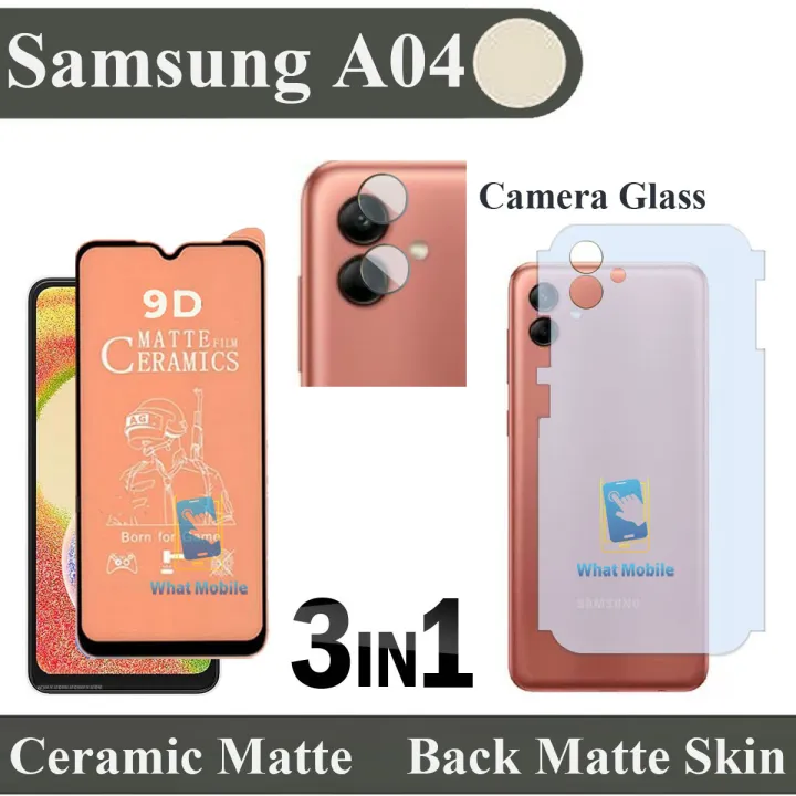 Pack of 3 - Samsung Galaxy A04 Ceramic Matte Glass Protector Full Glue Tempered Glass Screen Protector For PUBG + Back Matte Protector Soft Skin Sheet + Back Camera Glass Protector Flexible 9H Gorilla Lens Glass For samsung a04 - Transparent