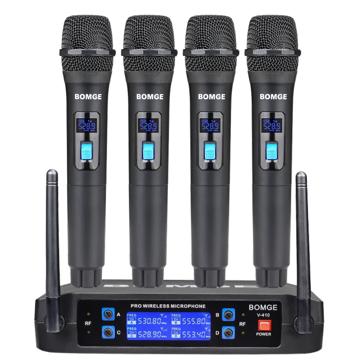 Professional BOMGE 4 channel wireless microphone System Cordless Mic Set With Four Handheld Mics Fixed Frequency, Long Range 200ft