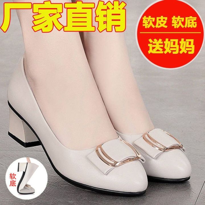 Real Soft Leather Soft Bottom Mom Shoes Chunky Heel Pumps Women's Comfortable Mid-Heel Low-Cut Work Shoes Spring and Autumn Small Leather Shoes Work Shoes